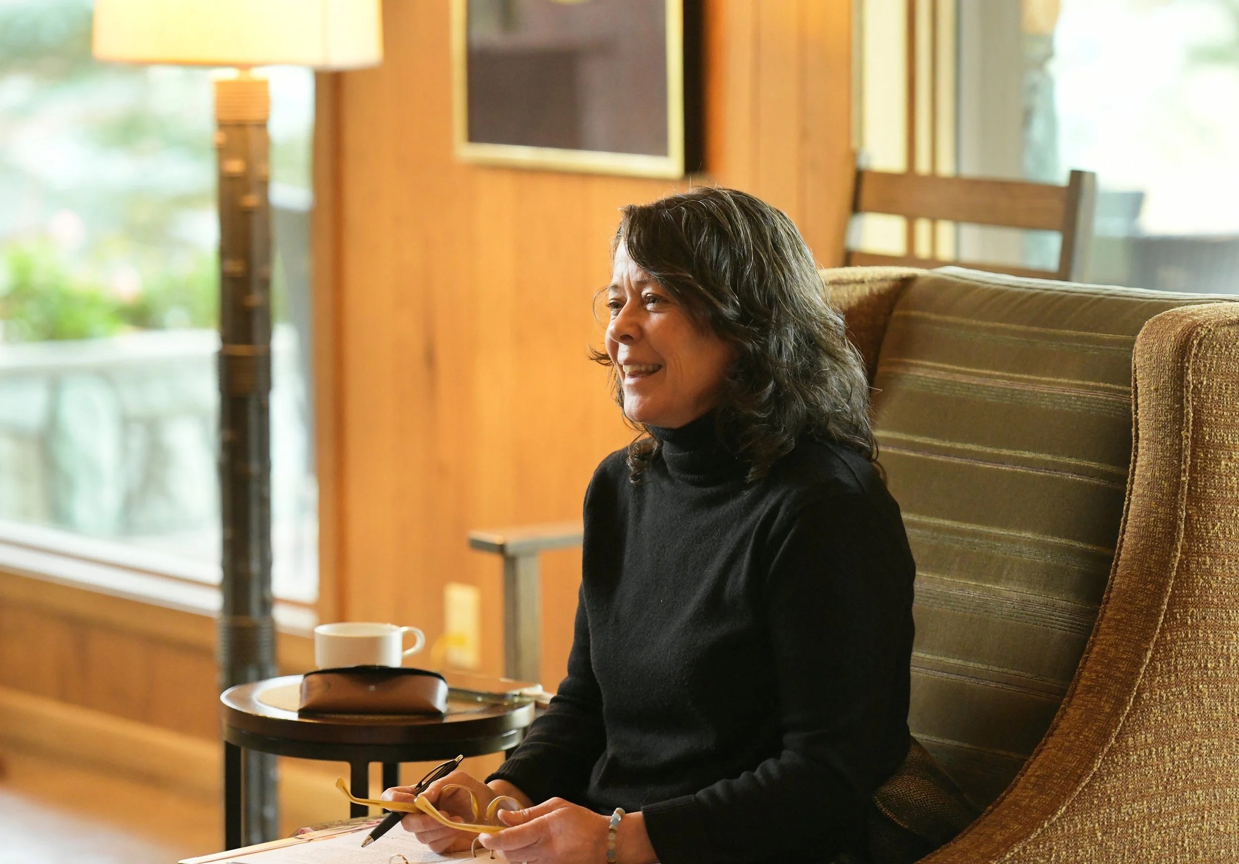 They worked on the question in silence in notebooks and on tablets. As the minutes ticked by, the storm that had been building over the ridgeline broke above the meadow. Rain pummeled the copper roof and wind gusted against the side of the house. The fire popped and crackled and threw light into the corners of the room. I felt a spike of joy as if my own genus loci had been summoned, though I’d never been to House on Metolius before. The landscape I draw from is a place of tall trees near water under autumn’s mercurial skies where wind and rain bluster around the house and dance through the treetops, where the hearth is both literal and internal.